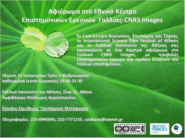 Το Caid-Κέντρο Κοινωνίας, Επιστήμης και Τέχνης, στο πλαίσιο των δραστηριοτήτων του, προγραμματίζει ένα άκρως ενδιαφέρον αφιέρωμα στο Γαλλικό CNRS (Centre national de la recherche scientifique – Εθνικό Κέντρο Επιστημονικών Ερευνών), σε συνδιοργάνωση με το Γαλλικό Ινστιτούτο της Αθήνας.