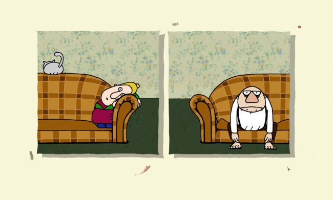Ό,τι συμβαίνει στον καναπέ σε δυο διαφορετικά, αλλά όμορα σαλόνια, την ίδια χρονική στιγμή. Μια γυναίκα, μια γάτα κι ένας άντρας… Μπορούν οι τοίχοι να χωρίζουν κόσμους;