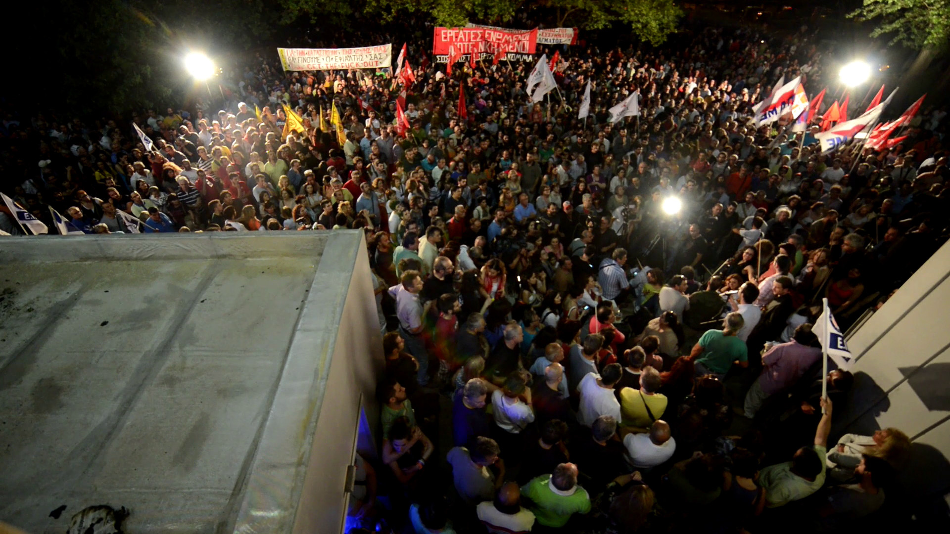 Ναι ναι ακριβώς, όπου κάποια στιγμή πετάγεται ένας εργαζόμενος της ΕΡΤ και λέει: «σας παρακαλώ πολύ, όσοι δεν έχετε δουλειά, να περάσετε έξω». Και εκεί που φεύγουν όλοι, πάω να φύγω κι εγώ. Κάποιος άνθρωπος όμως με κράτησε και μου λέει: «εσύ μείνε εδώ». Και έμεινα… Έτσι, μαζί με τους χιλιάδες Έλληνες και μαζί με τους εργαζόμενους της ΕΡΤ, ακούσαμε αυτές τις κυνικές δηλώσεις του Σίμου Κεδίκογλου, να μιλάει περί ιερών αγελάδων κ.τ.λ. και να κλείνει την ΕΡΤ. Δε σου κρύβω ότι εκείνη τη στιγμή, δεν πίστευα στα αυτιά μου. Προσπάθησα βέβαια να καταγράφω το γεγονός και όντως αποτελεί την πρώτη σκηνή του έργου, αλλά μόλις τελείωσε, έκλεισα την κάμερα και έβαλα τα κλάματα. Όπως και τόσοι άλλοι. Όχι γιατί τελείωνε μία συνεργασία που είχα για δέκα χρόνια με την ΕΡΤ, αλλά γιατί εκείνη τη στιγμή συνέβαινε μία κατάφωρη αδικία. Είναι μία από τις πιο κομβικές στιγμές της ελληνικής κρίσης, ακριβώς γιατί δεν πατάει σε καμία νομιμότητα. Είναι απολύτως αντιδημοκρατική και γι’ αυτό πιστεύω ότι σόκαρε όλους τους Έλληνες, αλλά και τους ξένους βέβαια.