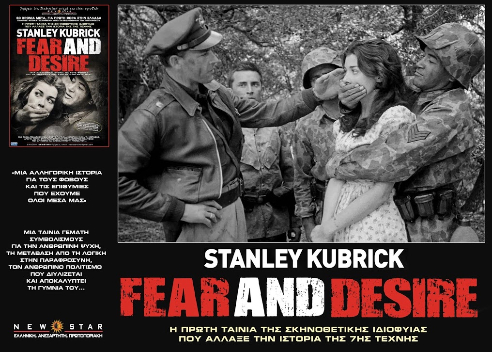 Το «Fear and Desire» (1953) του Στάνλεϊ Κιούμπρικ, είχαμε την ευκαιρία να το δούμε για πρώτη φορά στην μεγάλη οθόνη στην Ελλάδα, πέρσι τον Νοέμβριο στο πλαίσιο του 26ου Πανοράματος Ευρωπαϊκού Κινηματογράφου. Φέτος συμπληρώθηκαν δεκαπέντε χρόνια χωρίς τον κορυφαίο δημιουργό και η προβολή της πρώτη του δημιουργίας αποτελεί τον ιδανικό τρόπο για να θυμηθούμε έναν μοναδικό καλλιτέχνη της έβδομης τέχνης. Το φιλμ του Κιούμπρικ, παρουσιάζεται στις Κινηματογραφικές Αίθουσες σε διανομή της New Star, ενώ μαζί του θα προβάλλεται και η μικρού μήκους ταινία «The Seafarers» (1953) διάρκειας 28 λεπτών, που αποτελεί την πρώτη έγχρωμη ταινία του Στάνλεϊ Κιούμπρικ.