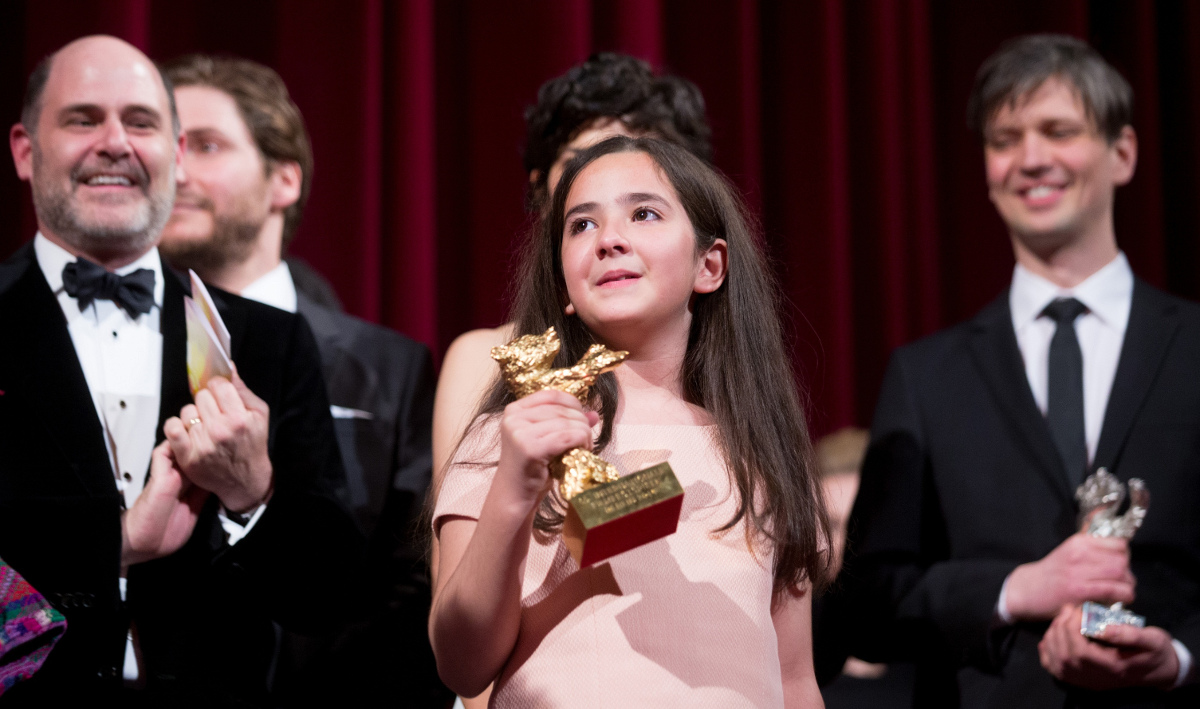 epa04620090 Hana Saeidi (C) holds the Golden Bear for the movie ‘Taxi’, which she accepted on behalf of Iranian director Jafar Panahi, during the closing and award ceremony of the 65th annual Berlin International Film Festival, in Berlin, Germany, 14 February 2015. The Berlinale runs from 05 to 15 February. EPA/MICHAEL KAPPELER