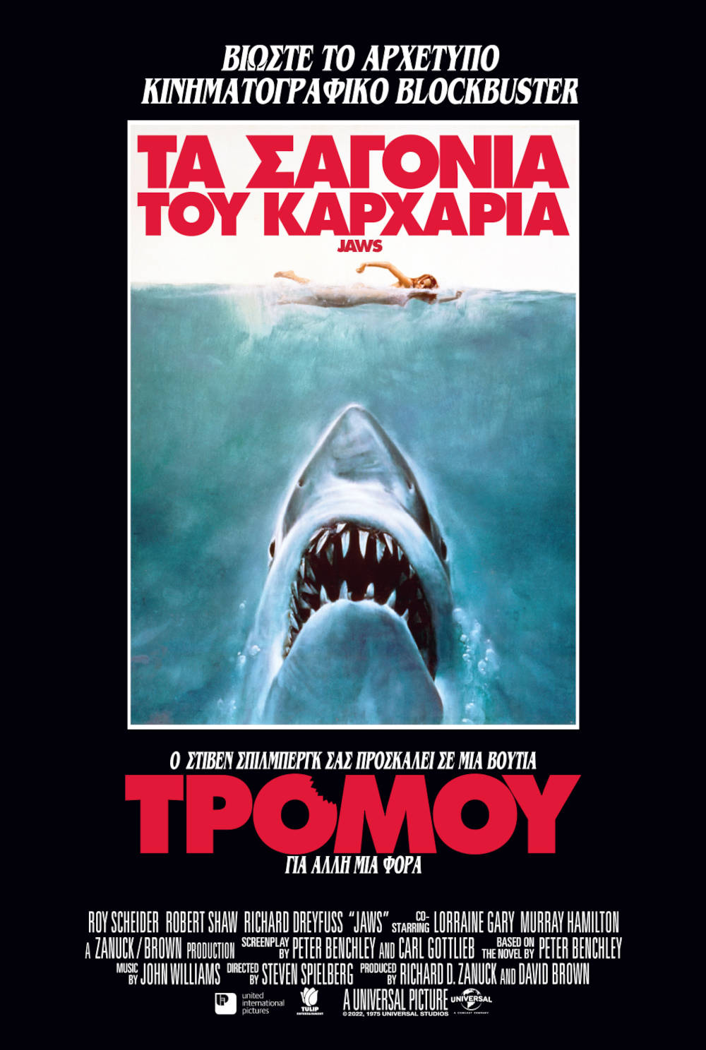 Το 1975, ο Στίβεν Σπίλμπεργκ σε ηλικία 29 ετών και έχοντας ήδη στο ενεργητικό του δύο μάλλον μέτριες ταινίες (Firelight – 1964, The Sugarland Express – 1974), ταράζει τα λιμνάζοντα νερά στην κινηματογραφική βιομηχανία του Χόλιγουντ, μεταφέροντας στην μεγάλη οθόνη το βιβλίο του Πίτερ Μπέντσλεϊ και υπογράφοντας ουσιαστικά, την πρώτη μεγάλη εισπρακτική επιτυχία στην ιστορία του Σινεμά. Τα «Σαγόνια του Καρχαρία» κυκλοφορούν σε επανέκδοση σε ψηφιακά αποκατεστημένη κόπια.