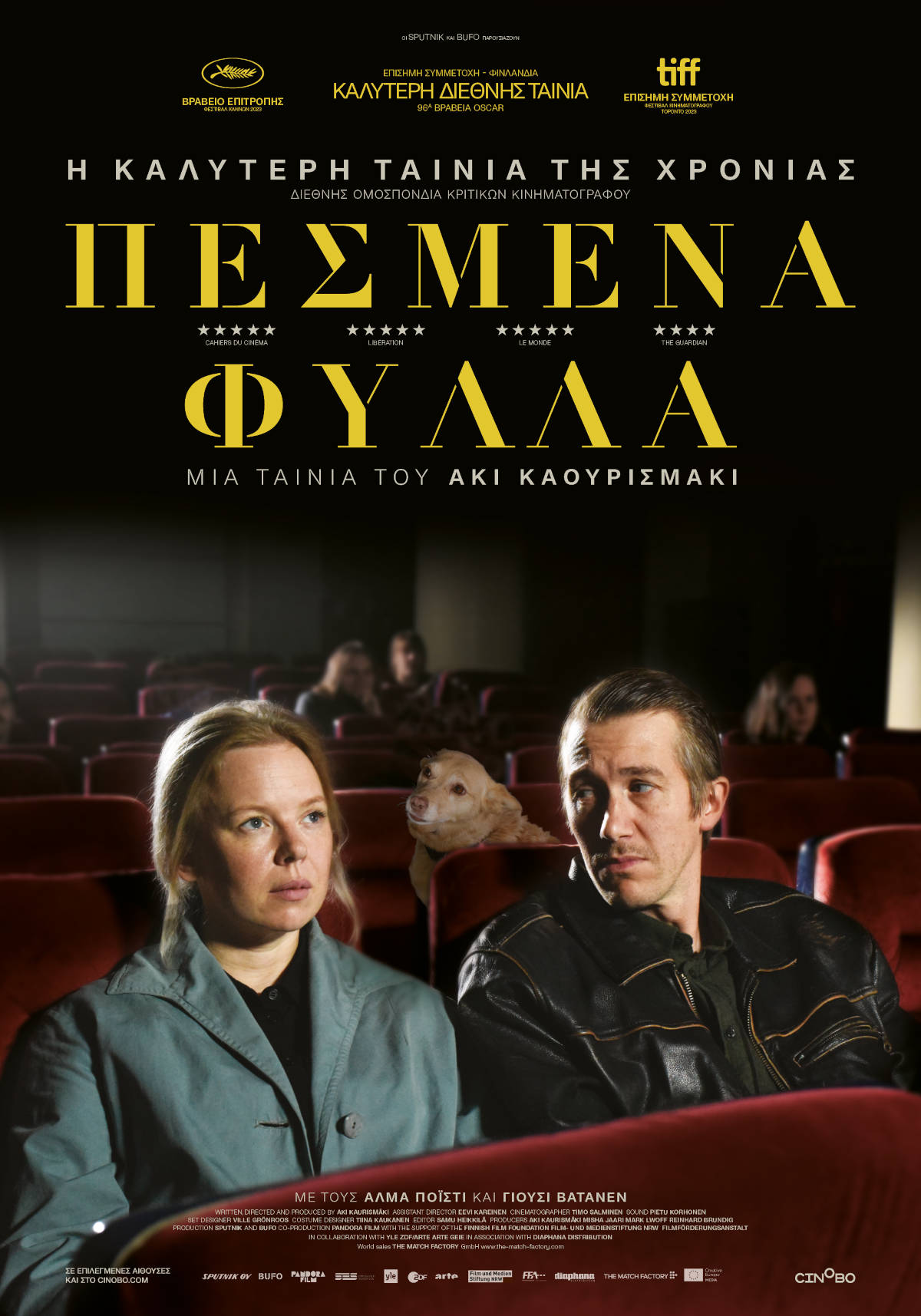 Το φιλμ «Πεσμένα Φύλλα», που απέσπασε το Βραβείο της Κριτικής Επιτροπής στις Κάννες και αποτελεί την επίσημη υποβολή της Φινλανδίας για το Όσκαρ Διεθνούς Ταινίας, είναι μια γλυκιά ιστορία αγάπης, ελπίδας, αλληλοσεβασμού και αλληλεγγύης, βγαλμένη από τον τρυφερό και αντισυμβατικό κόσμο του μεγάλου ουμανιστή του Σινεμά και αγαπημένου του ελληνικού κοινού, Άκι Καουρισμάκι.
